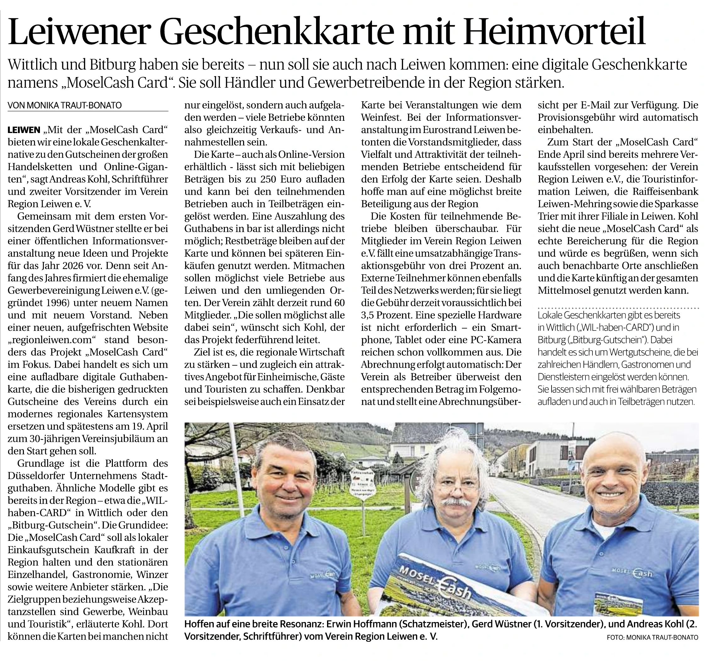 So titelt der Trierische Volksfreund in seiner aktuellen Ausgabe. Den kompletten Artikel findet ihr – ganz ohne Bezahlschranke – im News-Bereich unserer Website: regionleiwen.com/news/region-statt-amazon-so-funktioniert-die-moselcash-card