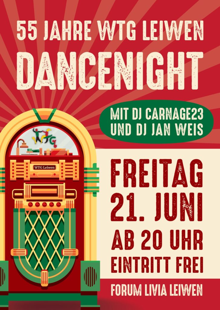 Die WTG wird dieses Jahr 55 Jahre alt und lädt deswegen am Freitag, den 21.06.2024 zu einer Jubiläumsparty/Dancenight ein. Ab 20 Uhr werden wir bei guter Musik von DJ Carnage23 und DJ Jan Weis im Forum Livia Leiwen, bis in die Nacht, feiern. Der Eintritt ist frei also kommt einfach vorbei und feiert mit uns.