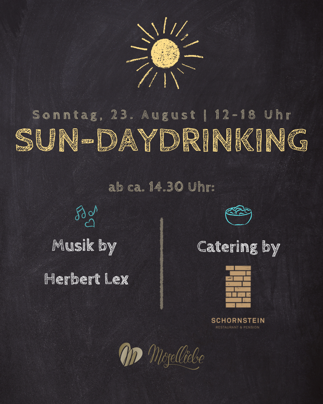 Am Sonntag, 23. August 2026 findet von 12 bis 18 Uhr das Sun Daydrinking im Moselliebe Weingarten statt.