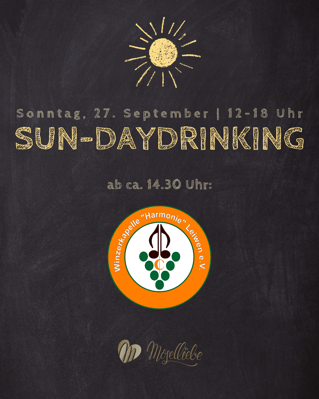 Am Sonntag, 27. September 2026 findet von 12 bis 18 Uhr das Sun Daydrinking im Moselliebe Weingarten statt.