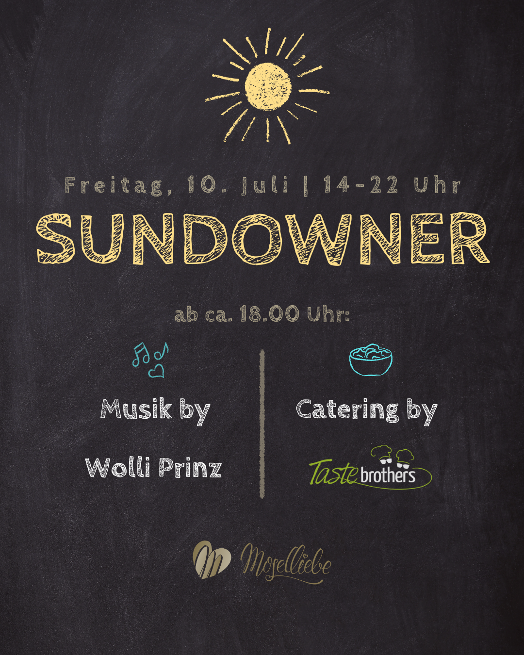 Am Freitag, 10. Juli 2026 findet von 14 bis 22 Uhr der Sundowner im Moselliebe Weingarten statt.